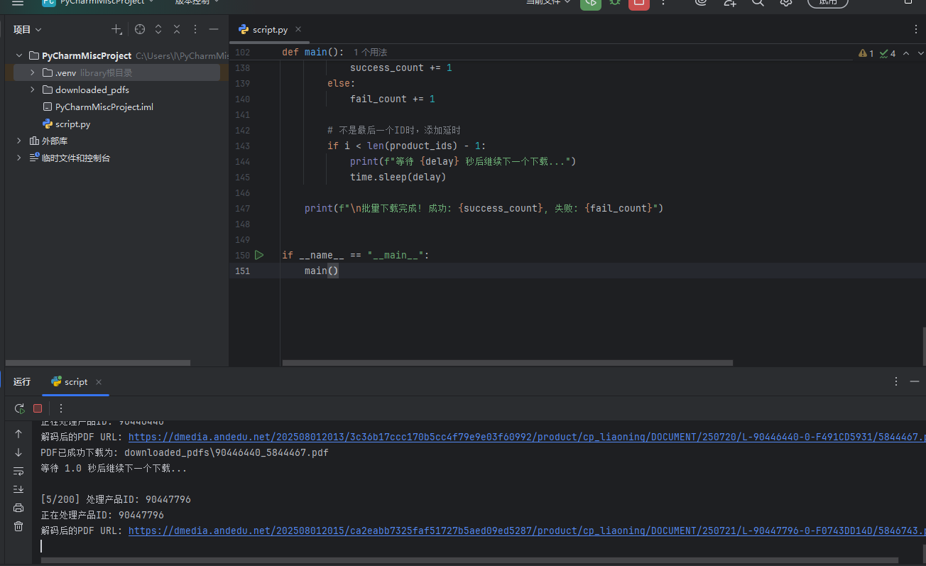 7.主函数提示用户输入多个产品ID,每行一个(因为我的ocr识别自动换行),输入空行或"end"表示结束输入。还要设置下载间隔时间,避免请求频繁导致被服务器封锁(虽然我也不知道什么时候会被封锁),然后批量下载。