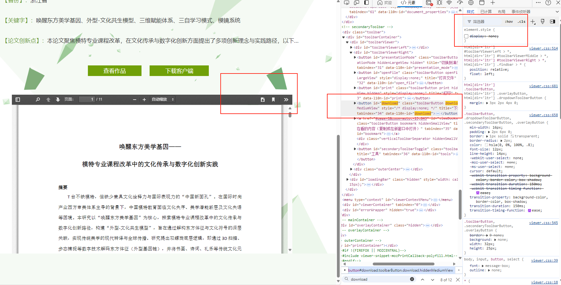 打开单篇论文网址,发现论文由pdf.js加载,但是原生的下载按钮被隐藏了,这个好解决